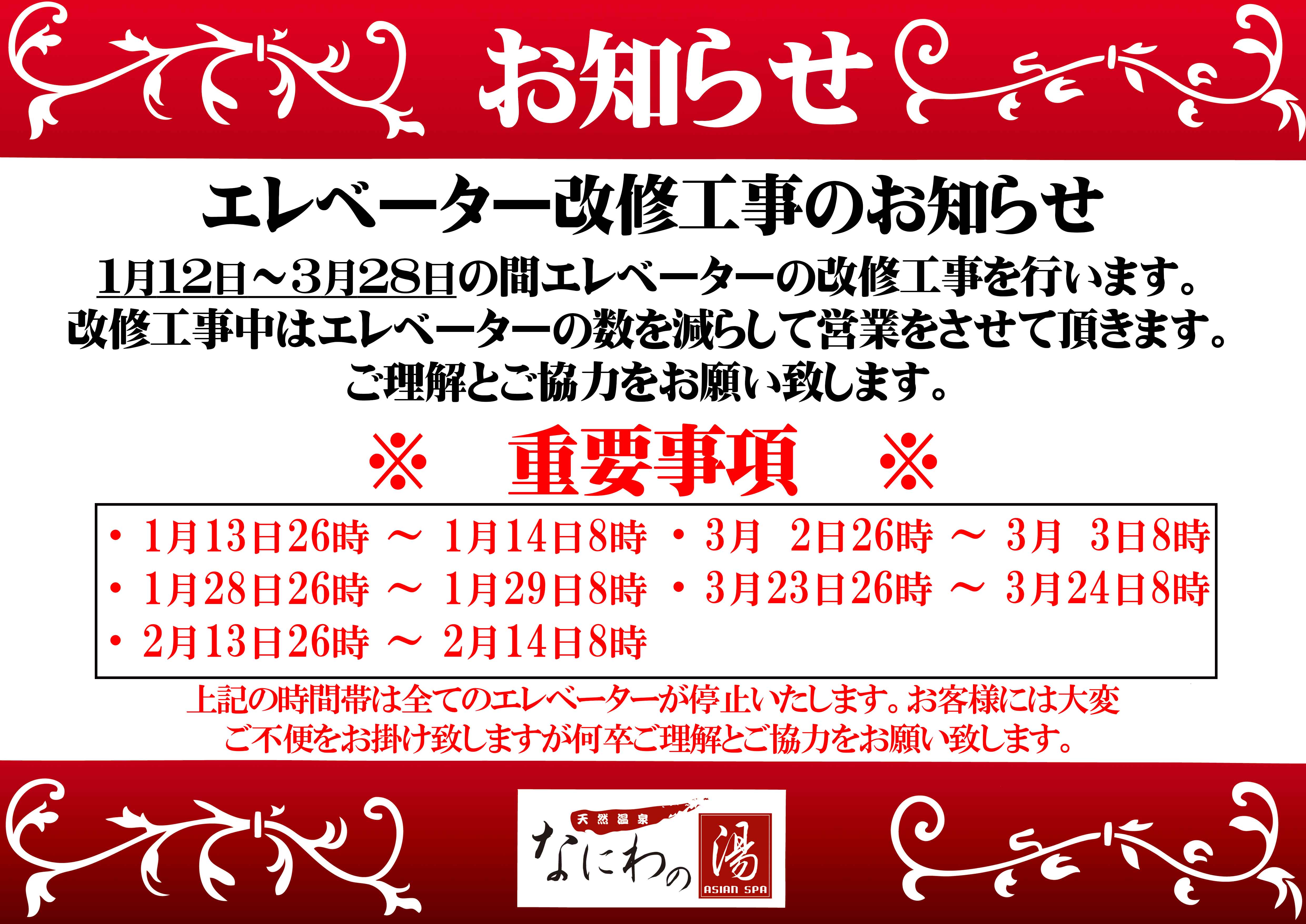 - 2026/01/08エレベーター改修工事のお知らせ